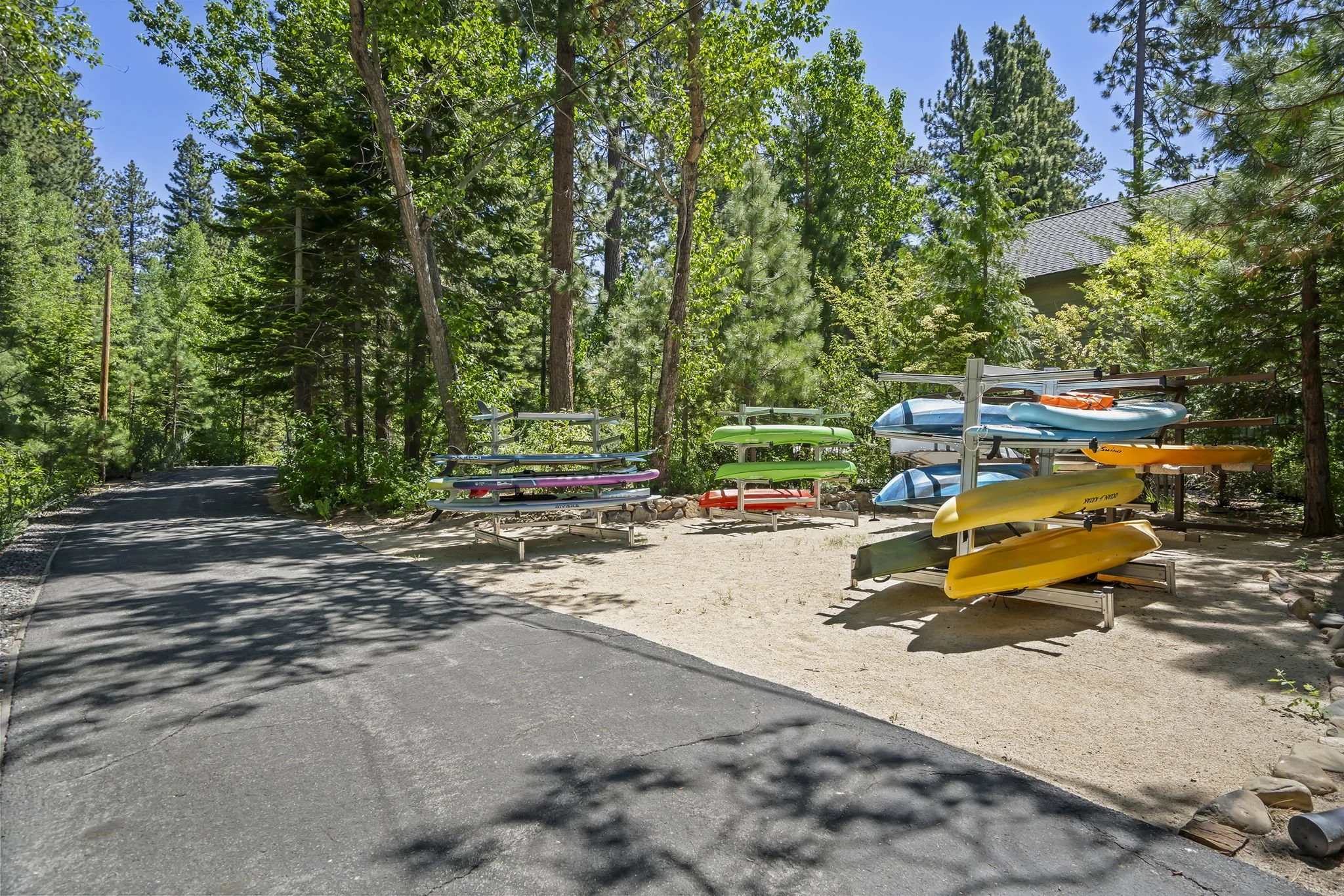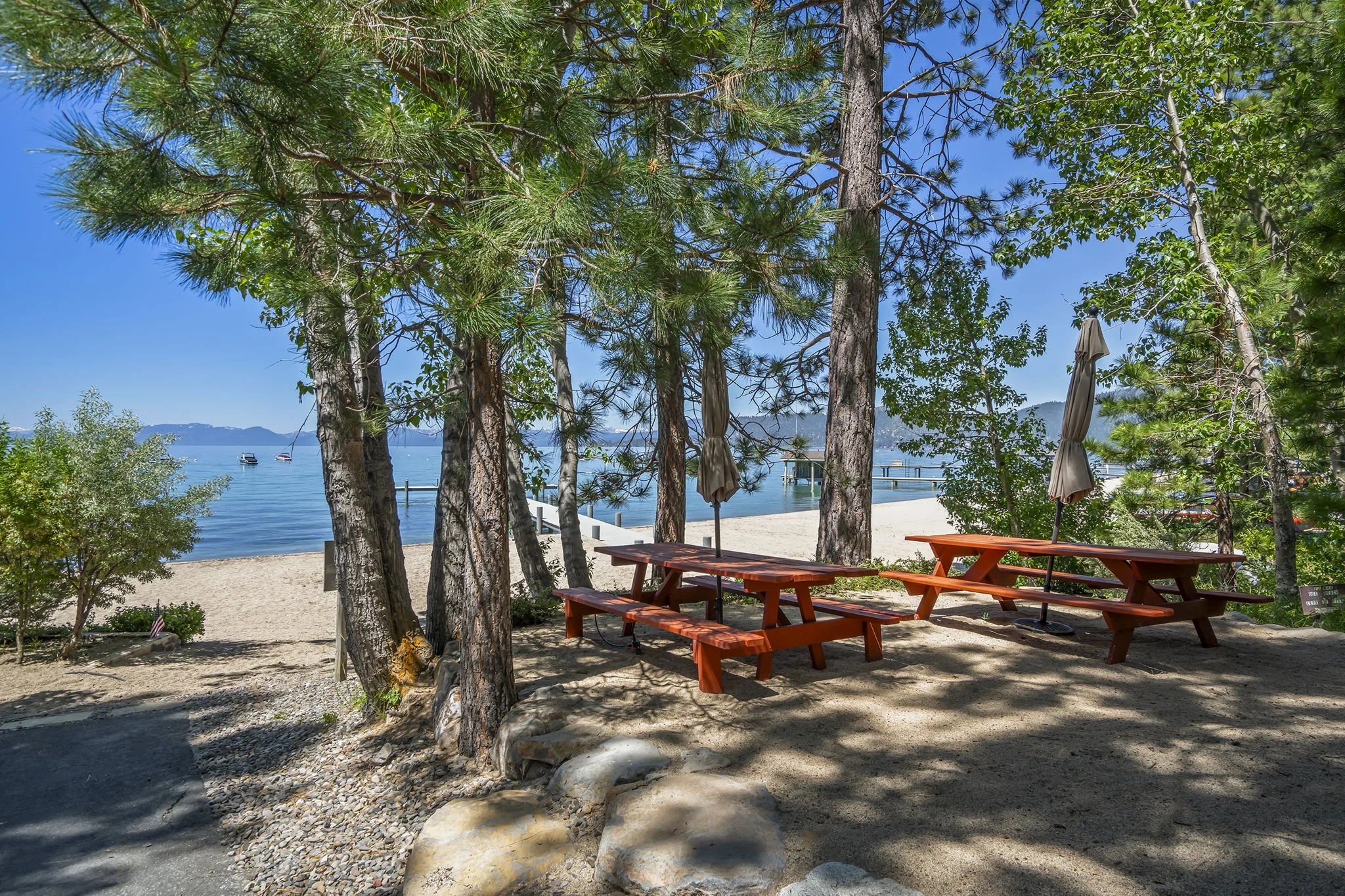 Private gated beach with pier, buoys, kayak racks, and swim platform